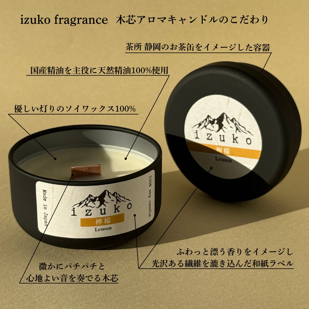 希少な瀬戸内産の檸檬オイルを主役に、落ち着いた木の香りを持つ吉野ひのきをブレンドしたizuko特製のアロマキャンドルです。